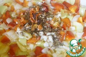 К луку с перцем добавить чеснок, пропущенный через пресс, орегано и кориандр, мелко порезанный перчик чили или сухой порошок, приправить соевым соусом.