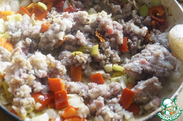 В сковороде разогреть растительное масло и выложить лук и перец, жарить около 5 минут, помешивая.