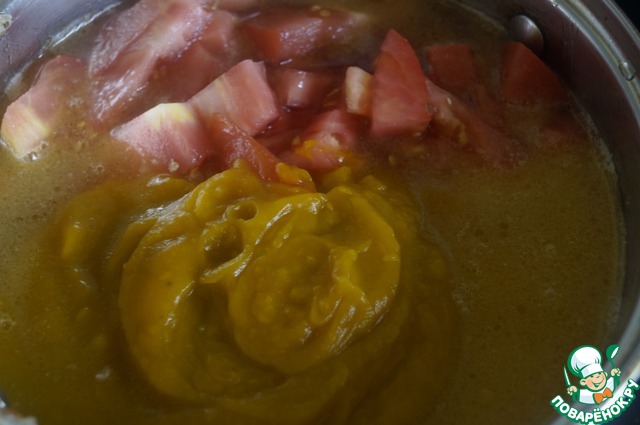 Переложить все в толстодонную кастрюлю, добавить томаты и тыквенное пюре, залить водой. Посолить по вкусу и довести до кипения, убавить нагрев и тушить еще 15 минут.