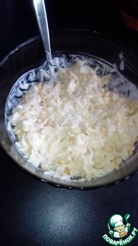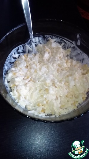 Добавить майонез (сильно много добавлять не следует, так как ананас хорошо пускает сок) по вкусу. Все хорошо перемешать.