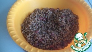 • 1. Предварительно замачиваем фасоль на 3-4 часа. По истечении этого времени в кастрюле варим чечевицу с фасолью вместе 1-1,5 часа. Я варю их в мультиварке на режиме "Бобы" в течении 1 часа 20 минут. Сразу же кидаю к ним пару листиков лаврушки и несколько горошин перца. Получается ароматнее.