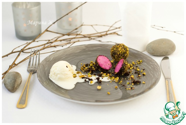 Подать с шариком мороженого, дробленым шоколадом и фисташкой.