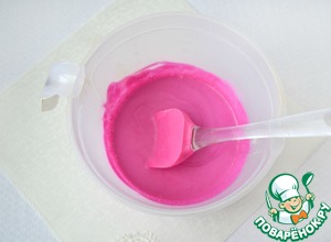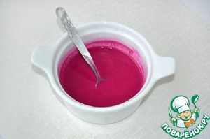 Сливки 33% жирности хорошо охладить, взбить. Добавить свекольный сок с желатином. Перемешать до однородности.