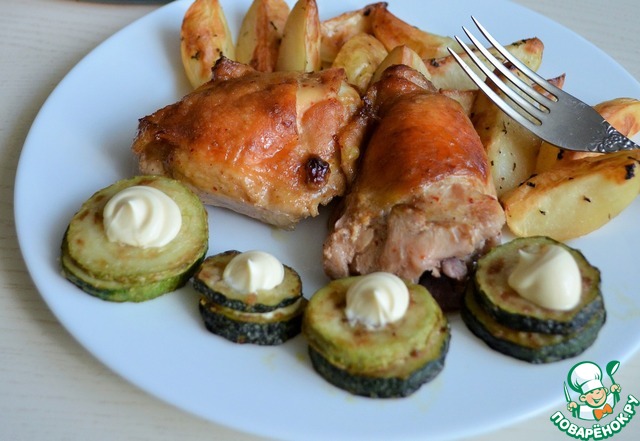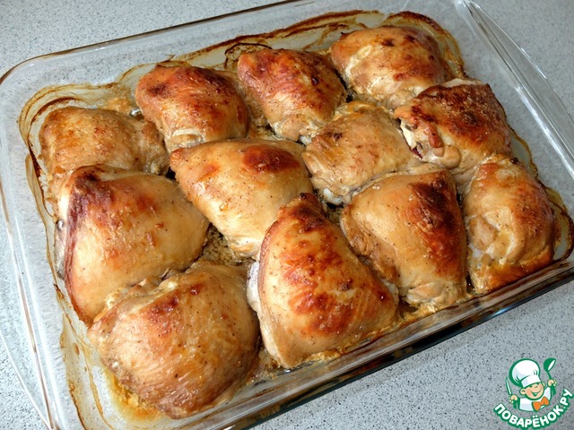 В форму для запекания выложить курицу вместе с маринадом. Отправить в духовку на 40 мин. при 200 град.