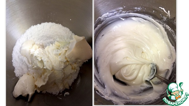 Тем временем готовим заливку. Хорошо взбиваем сливки и смешиваем с сахарной пудрой и сливочным сыром. |