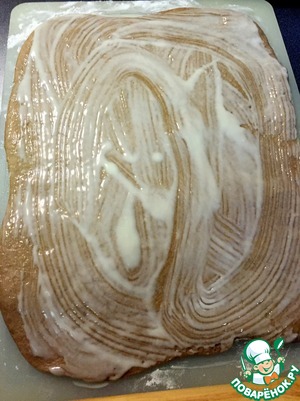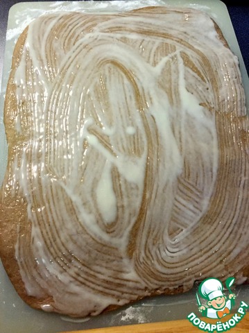 Готовые рулетики вынимаем из духовки и смазываем заливкой. Даем постоять минут 5. |