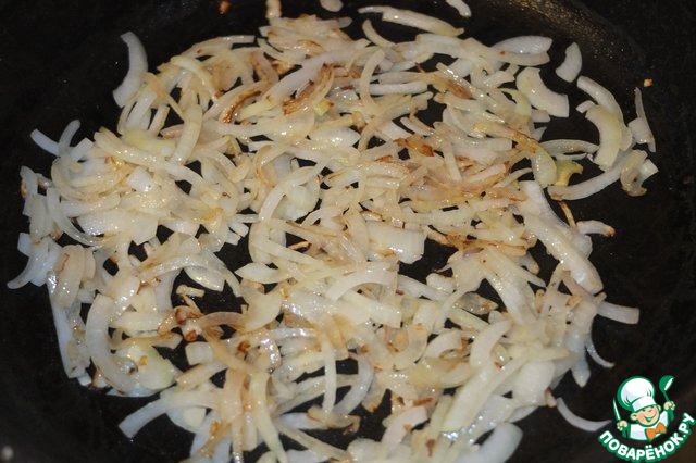 Лук, нарезанный полукольцами обжариваем до золотистого цвета.
