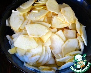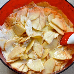 Выложить в миску с тестом яблоки... Осторожно все перемешать, стараясь не поломать тонкие яблочные дольки.