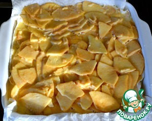 Огнеупорную форму для выпечки (25х25 см или 30х23 см) выложить пекарской бумагой смоченной в воде и как следует отжатой. Выложить яблоки в форму и разровнять.