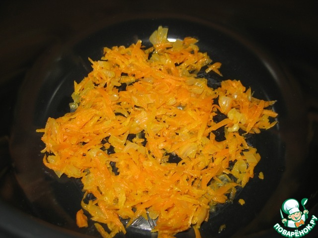 • Теперь помоем и почистим морковь и лук, обжарим с небольшим количеством масла (в мультиварке на режиме "Жарка" у меня это занимает 7-8 минут)