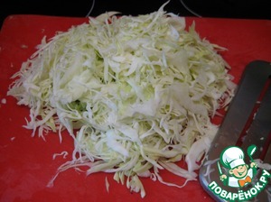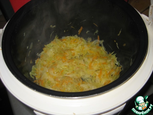 • А пока тонко шинкуем капусту, добавляем в чашу к моркови и луку, кидаем пару щепоток соли и пару ст. л. воды, тушим все вместе. В мультиварке мне хватило 15 минут на режиме "Тушение"