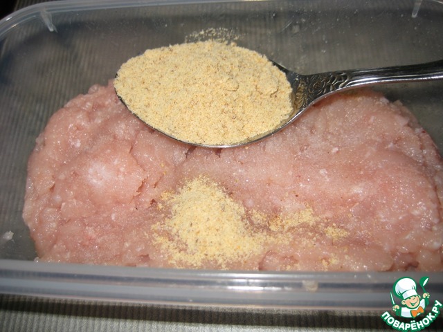 • Затем добавляем к нему 1 ст. л. панировочных сухарей и 1 ст. л. молока