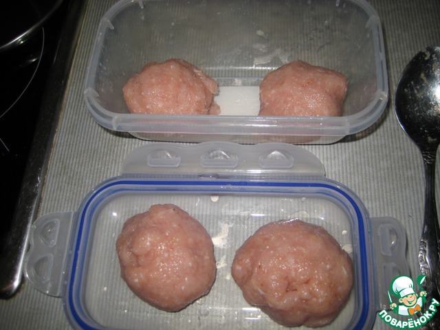 • Всего будем лепить 12 фрикаделек, так что делим фарш на части