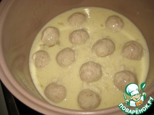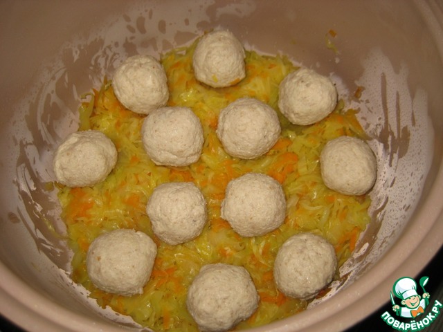 • Чашу, в которой будем готовить запеканку смазываем слегка маслом, на дно кладем половину риса, затем тушеную капусту, на неё водружаем фрикадельки