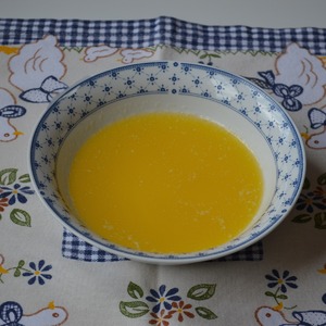 Влить тёплое молоко, аккуратно перемешивая венчиком.