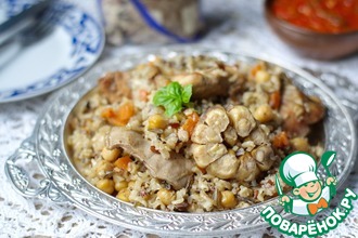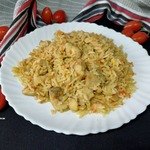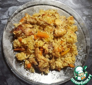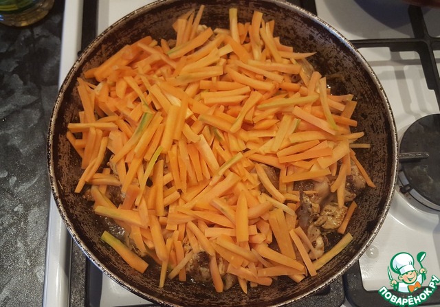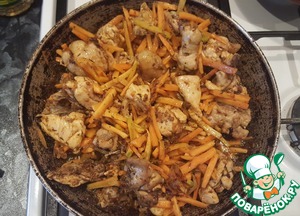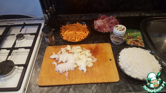 Рис промыть неоднократно (7-10 раз). Куриное мясо промыть, нарезать кусочками. Лук очистить, вымыть, нарезать полукольцами (2-3 головки лука). Морковь очистить, вымыть, нарезать тонкими ломтиками.