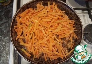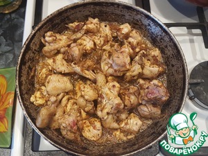 Долее нагреть сковороду и положить лук. Лук жарить до золотистого цвета на быстром огне (3-4 минуты). Далее добавить мясо, приправу, посолить, поперчить, добавить зиру, барбарис жарить еще минут (8-10).