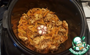 После обжарки мяса добавить морковь, жарить еще минут 5. Переложим все в мультиварку. Далее кладем по середине чеснок (1-головка чеснока) и засыпаем рисом. Заливаем все водой (примерно палец от риса). Солим еще раз и закрываем крышку. Выбираем в меню Плов и нажимаем на Пуск.