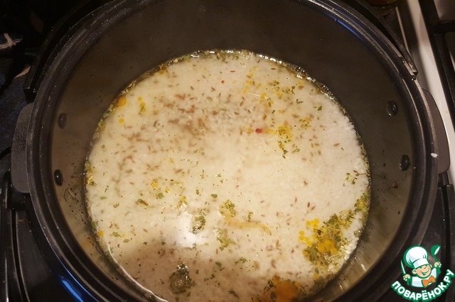 Добавляем специи для плова, зиру, барбарис, перец красный, солим.