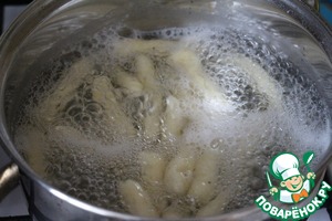 Из картофельного теста скатать жгутики длиной 4-5 см. При необходимости поверхность стола припылить мукой или крахмалом.