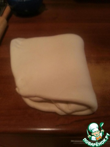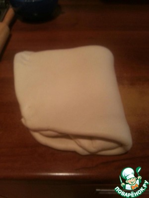 Раскатываем тесто, смазываем рукой растопленным маргарином, складываем пополам, еще раз смазываем, еще пополам, еще раз смазываем. Потом опять раскатываем, опять смазываем, опять складываем и так пока не кончится маргарин. Получается где-то 3-4 раза. Таким образом мы делаем тесто слоенным.