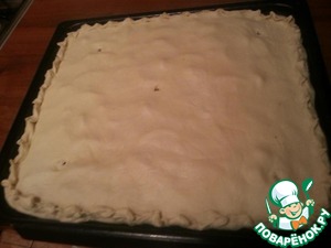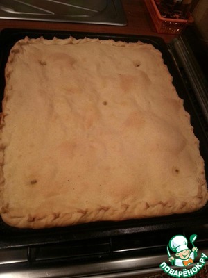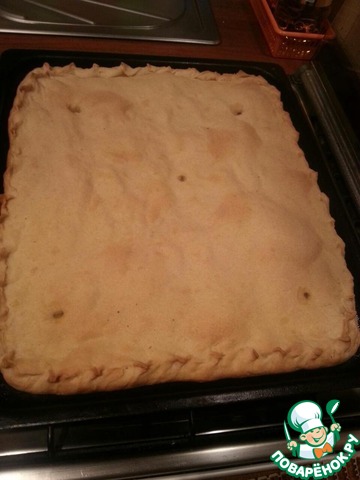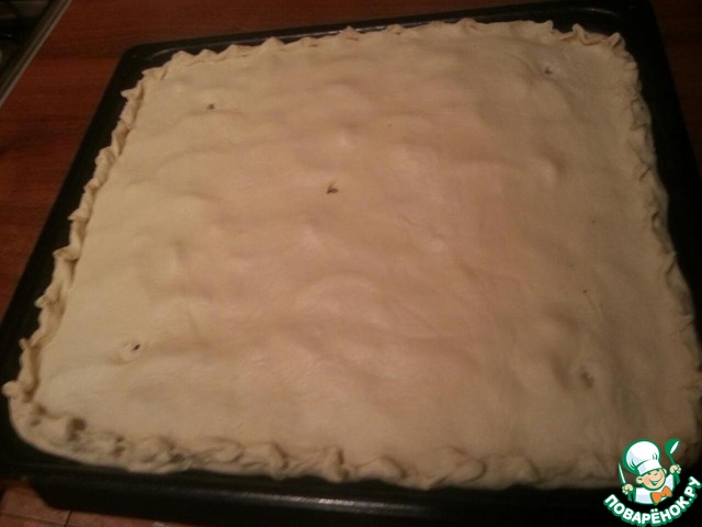 Далее раскатываем 2/3 теста и перекладываем его на противень. Выкладываем фарш, посыпаем курдюком (не обильно). На фарш выкладываем картофель (без нахлеста), посыпаем солью, перцем, специями, курдюком. Сверху закрываем пирог оставшейся 1/3 частью теста. Склеиваем края. Делаем дырочки, чтоб пар выходил через них, а не рвал швы на краях. Сверху можно посыпать панировочнымии сухарями или смазать яйцом. -