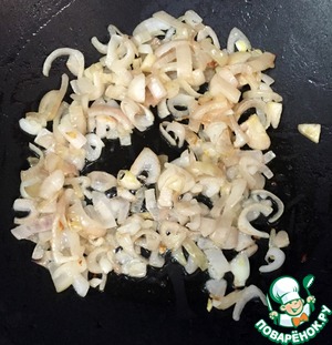 • Лук порезать, чеснок измельчить в чеснокодавилке и слегка обжарить.
