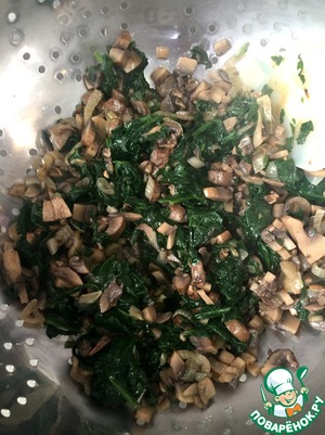 Можно использовать замороженный шпинат. Тогда его просто нужно хорошо отжать и смешать с готовыми грибами.