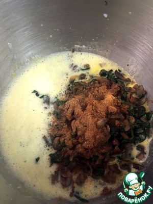 • И добавляем приготoвленные грибы со шпинатом и мускатный орех. Перемешиваем.