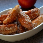 Каждый кусочек яблока окуните в холодную воду для того, чтобы карамель стала более хрустящей и не липкой