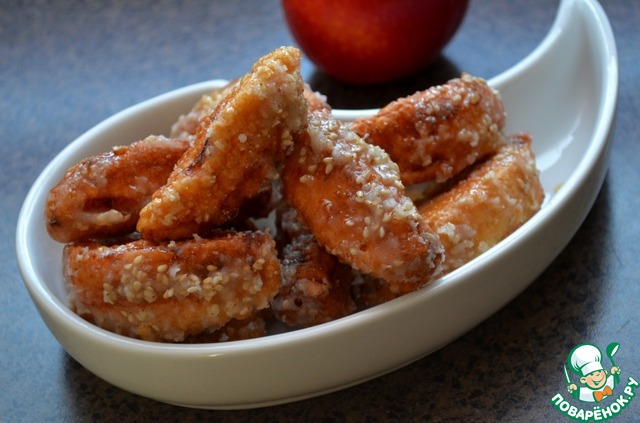 .. затем отряхнув с яблок излишки муки, опустить в яичный кляр, хорошенько перемешать...