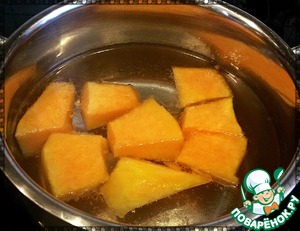 Тыкву отварить до готовности и взбить блендером до пюреобразного состояния. Так же можно использовать детское тыквенное пюре.