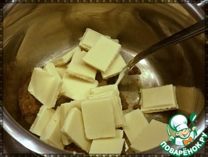 В тыквенное пюре добавить все пряности, перемешать и прогреть около минуты на среднем огне. Далее добавить поломанный белый шоколад и постоянно перемешивать до полного растворения шоколада. Снять с огня и охладить до комнатной температуры.