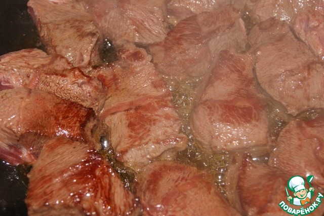 • Сильно разогреть на сковороде масло и быстро обжарить мясо со всех сторон. Дальше я готовила мясо в мультиварке, но оно прекрасно тушится в кастрюле с толстым дном, на медленном огне.