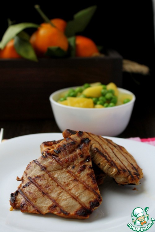 Подавать сразу же, с любимым гарниром. На гарнир у нас были ананас с сахарным горошком, слегка сбрызнутые соевым соусом. Приятного аппетита!