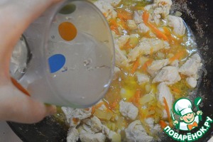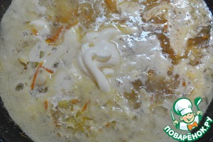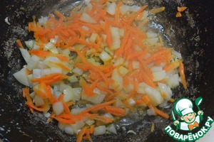 Обжарить овощи на растительном масле. Всыпать муку, перемешать с овощами и