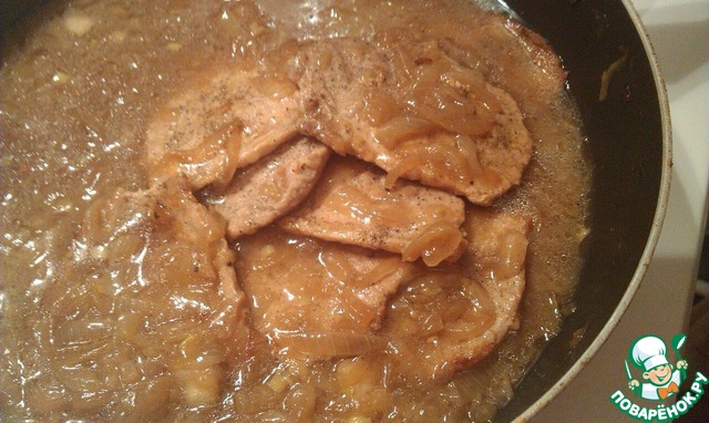 После того как все лангеты обжарены, на сковороде осталось много прижаренного мясного сока - в нем весь вкус нашего будущего соуса. Его надо деглазировать (т. е. растворить в жидкости). Для этого, ни в коем случае не моя сковороды, всыпьте в неё нарезанный полукольцами лук и обжаривайте, помешивая, около 5-7 минут. После чего влейте вино и, опять же, помешивая, выпаривайте его, собирая со дна и стенок сковороды все соки.