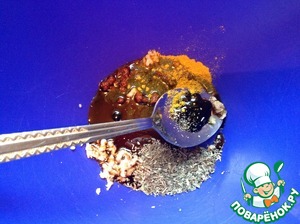 В посуде для маринования смешать все специи, 1 зуб. чеснока, пропущенного через пресс, соевый соус и бальзамик. Тщательно перемешать маринад.