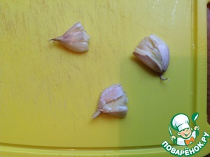 Оставшиеся 3 зуб. чеснока, не очищая, расплющить лезвием ножа. Чеснока можно взять и больше