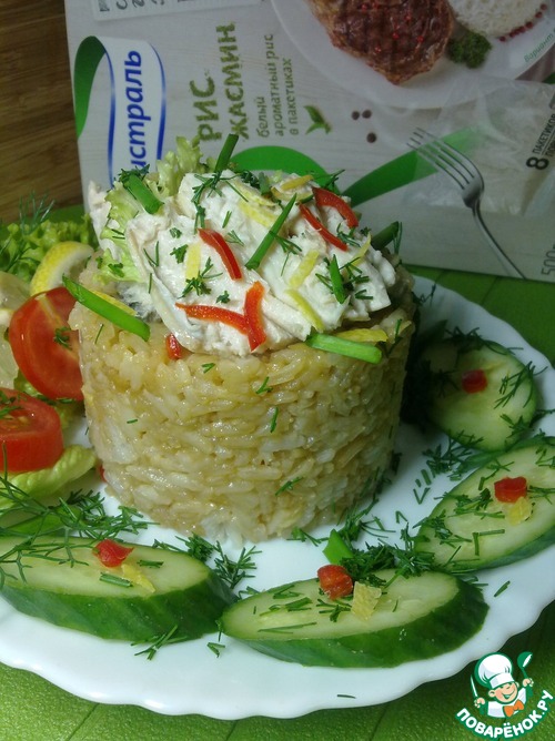 • Выложите рис на тарелку аккуратной горкой или в кулинарную форму, сверху уложите рыбу.