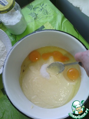 Растопим масло, добавим сахар и ванильный сахар. Перемешаем. Туда же добавим яйца, хорошо венчиком мешаем.