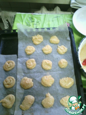 На пергамент ложкой или мешочком кондитерским выкладываем лепешки на некотором расстоянии друг от друга, тесто форму не держит