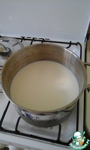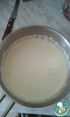 8 желтков взбить и в эту массу добавить сметану. Все смешать и тонкой струйкой влить молоко.