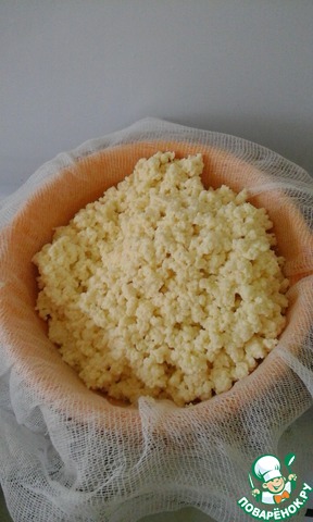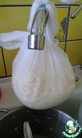 Марлю сложить в два слоя и выложить массу в нее, дав сыворотке стечь в течение 9 часов.