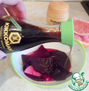 Вареную теплую свеклу нарезать полудольками, лук- полукольцами, залить маринадом из грейпфрутового сока, 2ст. л. соевого соуса ТМ «Киккоман» и меда. Оставить мариноваться на 15 минут.