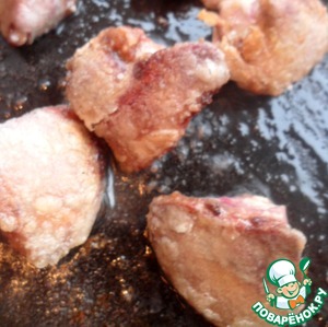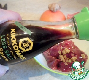 Нарезать печенку крупными кусочками, добавить тертый имбирь, 1ст. л. ТМ «Киккоман» и оставить мариноваться на 10 минут.