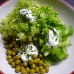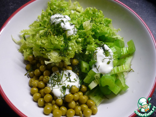 Для второго варианта добавляем к "зеленым" горошек. Я, не церемонясь, сразу банку) И заправка та же.