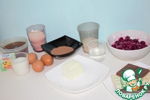 Подготовим ингредиенты. Вишню засыпать 6 ст. л сахара, перемешать, выложить в кастрюлю и оставить на 15-20 минут, что бы дала сок. Масло достать из холодильника (для крема оно должно быть мягким). 1 плитку молочного шоколада натереть на мелкой терке.