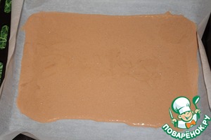 Вылить тесто на противень, застеленный пергаментной бумагой. Хорошо разровнять. Выпекать в предварительно разогретой духовке, при температуре 220 градусов, 6-7 минут.