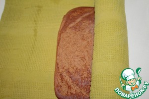 Готовый корж достать из духовки, выложить на полотенце, свернуть рулетом и оставить остывать.